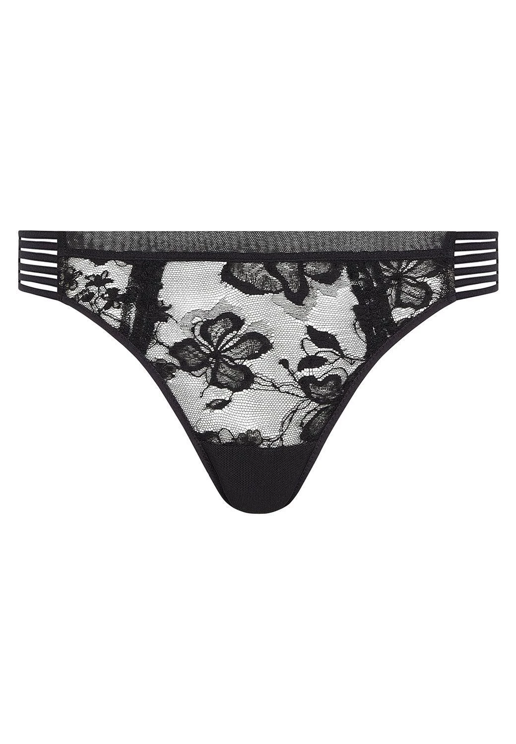 Tanga von Chantelle X aus floraler Leavers Spitze und transparentem Tüll. Der Tanga verfügt über mehrere verführerische Cut-Outs, sowohl an den Seiten als auch hinten und rundet seinen unvergleichlichen Look durch ein bezauberndes Schmuckelement im unteren Rücken ab.