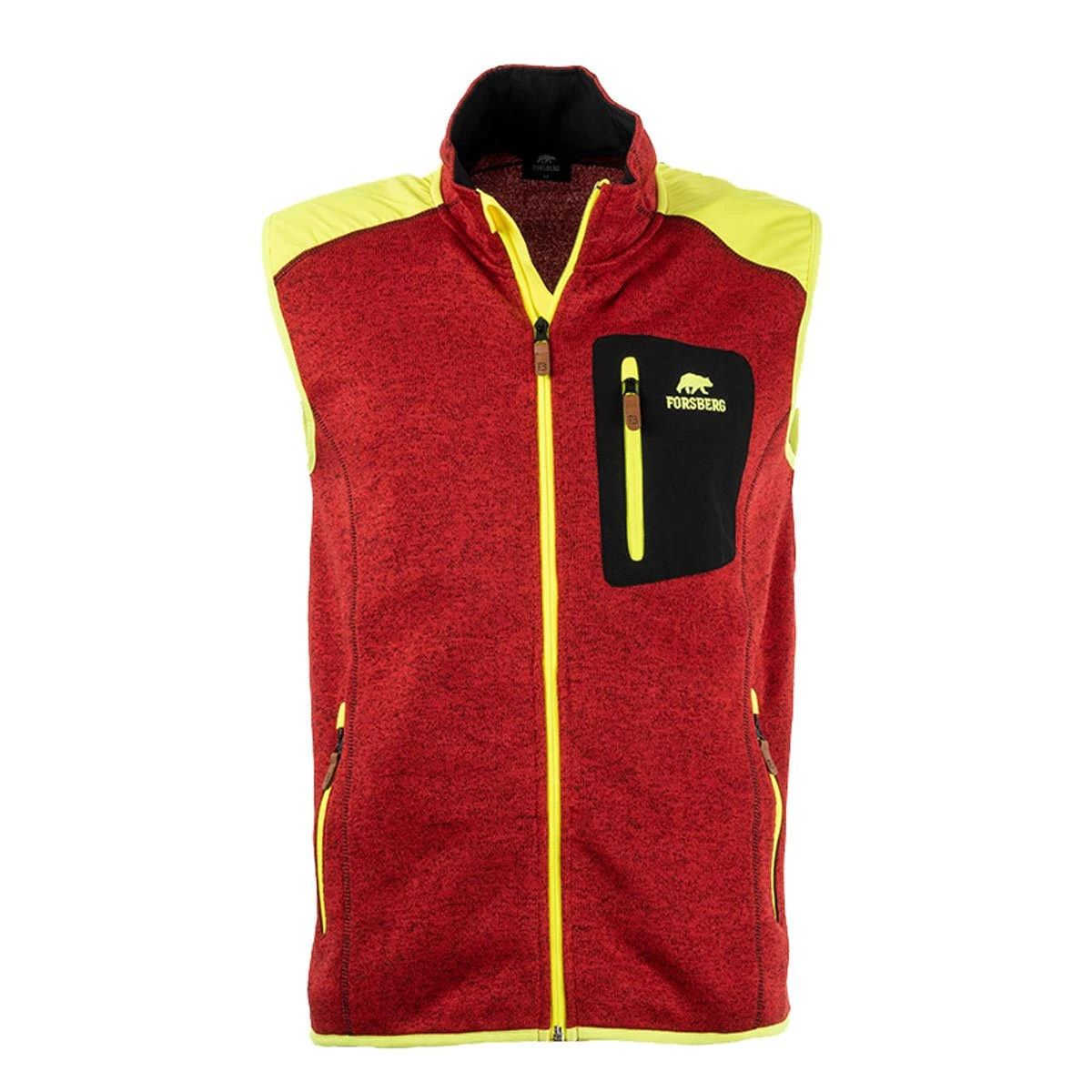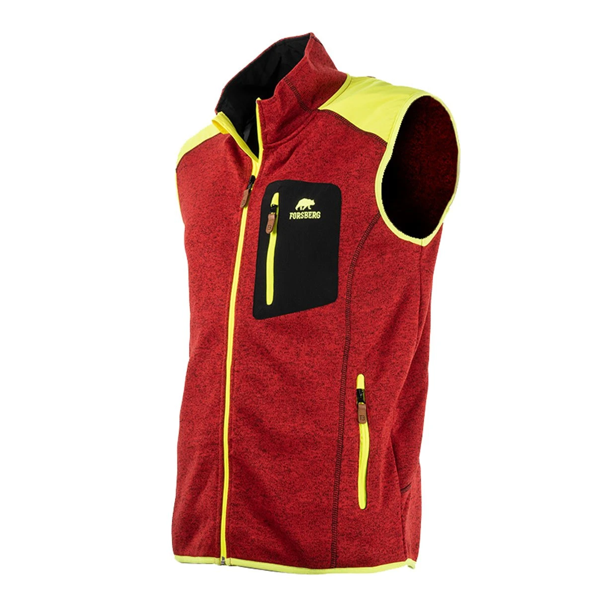Die Forsberg LÖNNA ist aus widerstandsfähigem Strickfleece gefertigt. Die Schultern sind mit einem abriebfestem Stoff in gut sichtbarem neongelb verstärkt. Der Frontzipper ist durchgehend bis in den Kragen und wie auch die Reissverschlüsse der Seitentaschen und der Brusttasche in grellem Neongelb gehalten. Der hochstehende Kragen ist innen leicht gefüttert und trägt wie auch der Kinnschutz zu hohem Tragekomfort bei. Der Bund ist durch ein gelbes Elastikband verstärkt und schliesst perfekt ab. Die Brusttasche ist aufgesetzt und bietet neben ausreichend Stauraum auch Platz für eine Logoaufbringung. Die beiden Fronttaschen bieten ebenfalls sehr viel Staufläche. Der Rücken ist leicht verlängert und deckt auch in gebeugter oder kniender Position sauber ab.