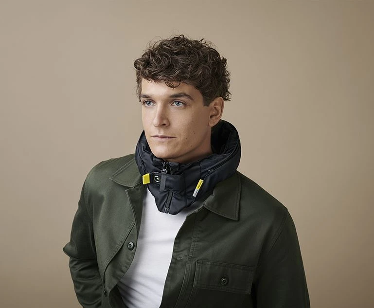 - Ergonomisch geformter Kragen wird um den Hals getragen