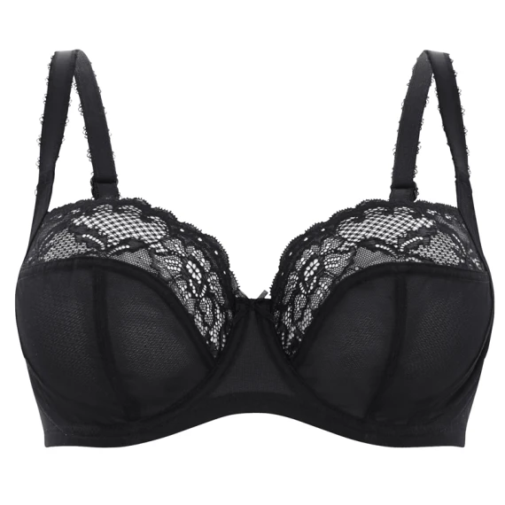 Der Jasmine Balconette BH von Panache ist in der Farbe Black erhältlich. Der BH hat oben an den Körbchen einen Rand aus elastischer Spitze. Seitlich sind Verstärkungen eingesetzt welche den Busen schön nach vorne formen. Zwischen den Körbchen ist eine niedliche Schleife.