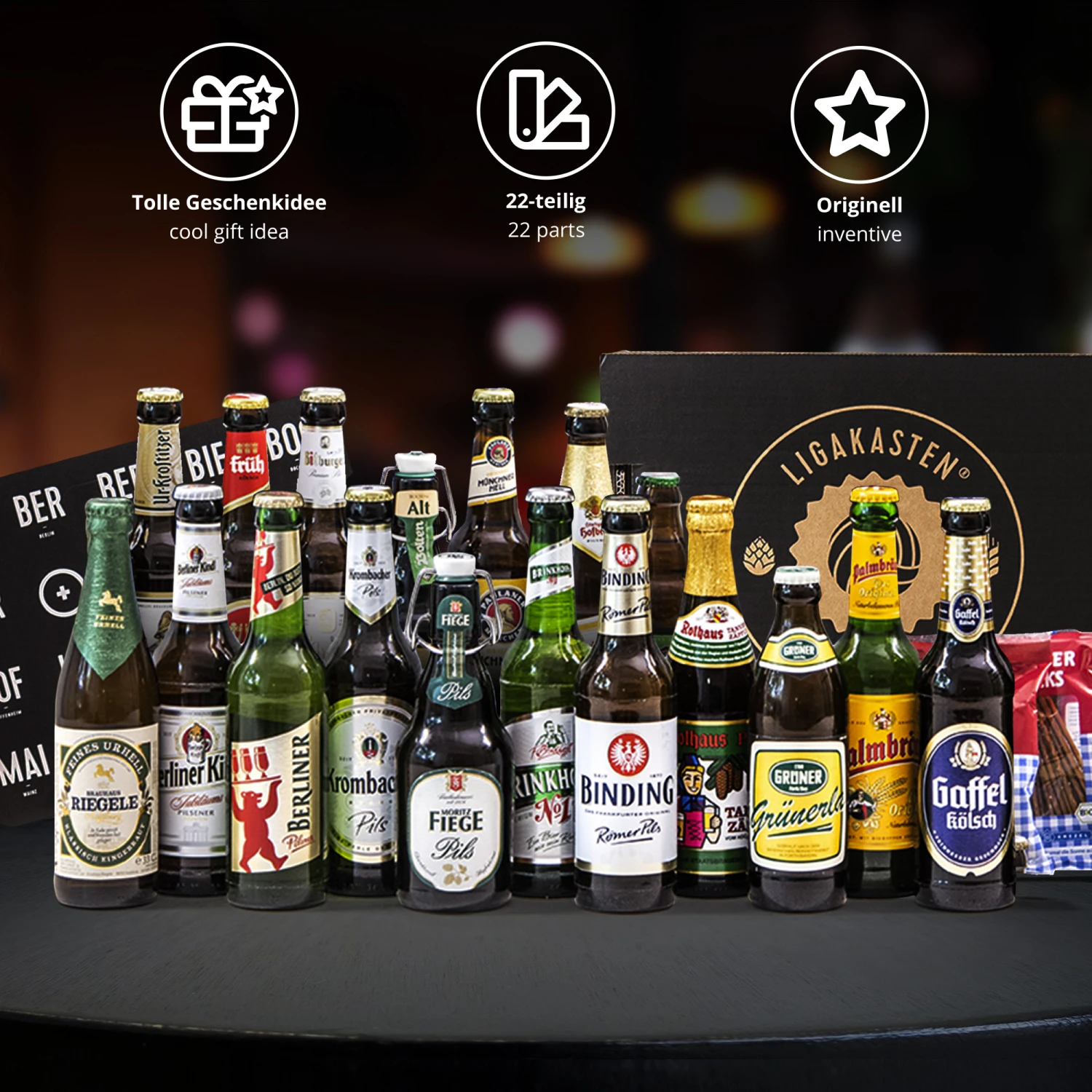 - Inhalt: 18 Sorten Bier (6,3 Liter), 2 Packungen Mini-Brezel, 6 Bierdeckel, eine Logopappe als Abdeckung und eine Städteübersicht