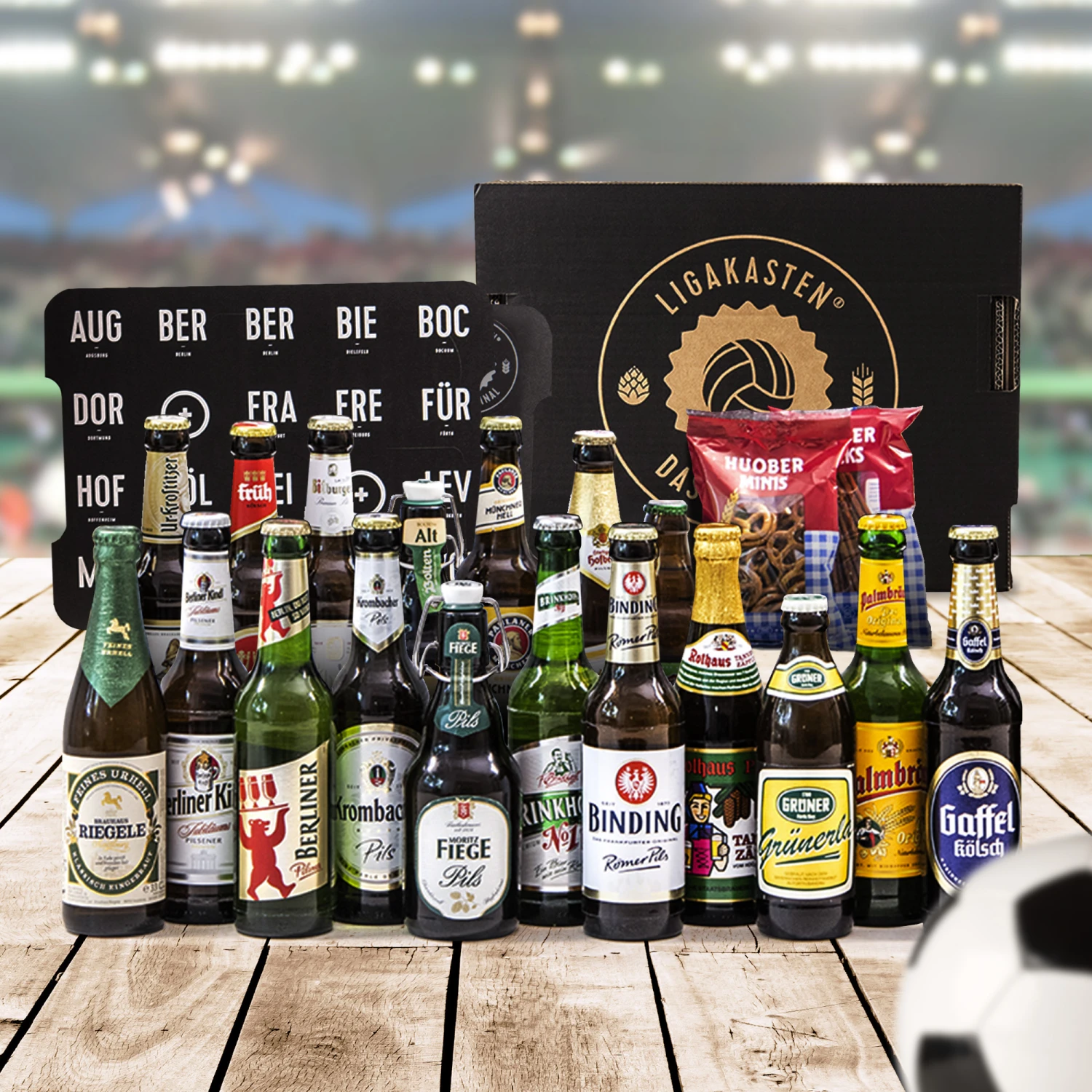 Fußball und Bier gehören einfach zusammen? Stimmt! Und genau deswegen ist der Ligakasten genau das richtige Geschenk für alle Fußballfans! Doch es handelt sich hierbei nicht etwa um einen einfachen Kasten mit nur einer Biersorte, der beim nächsten gemeinsamen Fußballabend geleert werden kann. Nein, dieser Kasten ist etwas ganz Besonderes! 18 Vereine aus unterschiedlichsten Städten in Deutschland spielen in der ersten Liga. Und für jede dieser Städte gibt es eine passende Flasche Bier im Kasten. So findest Du beispielsweise für die Stadt Leipzig das bekannte Ur-Krostitzer Pilsner und für Dortmund ein Brinkhoff’s No.1.