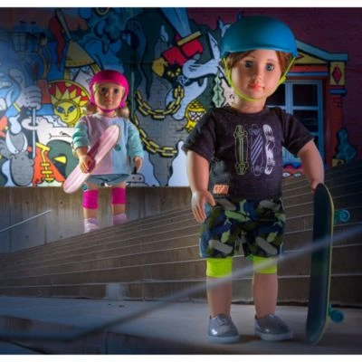 Besuche den Skaterpark und stelle allen deinen neuen Freund Theodore vor! Die coole Jungenpuppe von Our Generation kann es gar nicht erwarten, seine fantastischen Tricks vorzuführen. Er hat kurzes braunes Haar und leuchtend blaue Schlafaugen, trägt ein T-Shirt mit Skateboard-Aufdruck, passende Shorts und ein Paar Laufschuhe. Außerdem hat er ein buntes Paar Knieschoner und einen Helm, damit er bei jedem sportlichen Abenteuer geschützt ist!