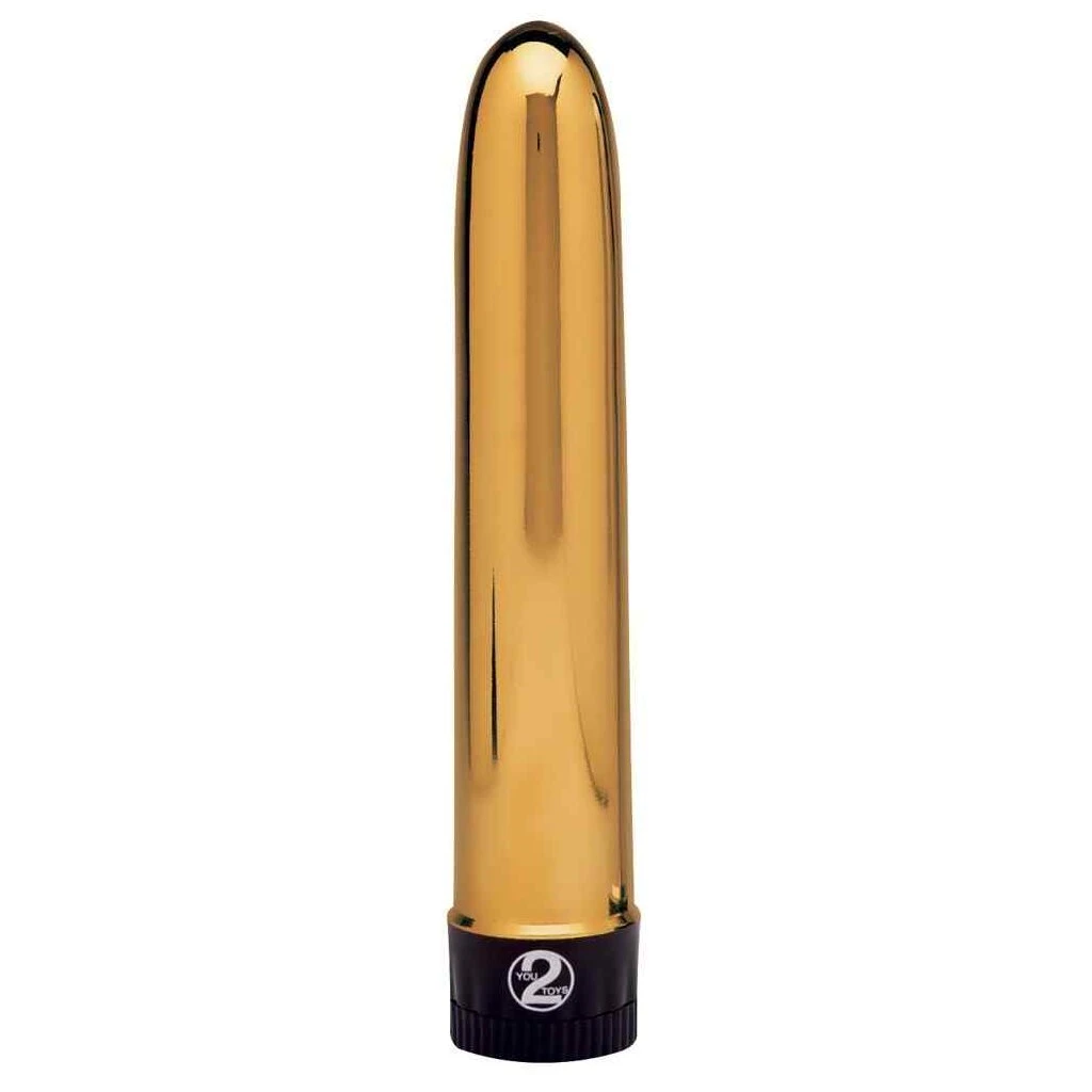 Goldfarbener Lustspender im edlen Look. Herrlich gleitfreudig flutscht er in IHRE Lusthöhle und bringt jeden Lustnerv zum Glühen. Mit stufenlos einstellbarer Power-Vibration. Ca. 19 cm lang, Ø ca. 3,5 cm. Material: ABS. (Batterien bitte extra bestellen: 2 x Baby).